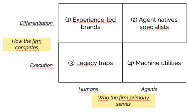 These two dimensions define a simple but uncomfortable matrix. The point of this matrix is not to label companies, but to surface trade-offs. Very few firms can occupy more than one quadrant sustainably. And some strategies that made sense in human-centered markets become actively dangerous once agents take over selection. Strategy, in this context, is less about ambition than about legibility. The horizontal axis captures who the firm primarily serves: human principals, or autonomous agents acting on their behalf. The vertical axis captures how the firm competes: through differentiation, or through commoditized execution.